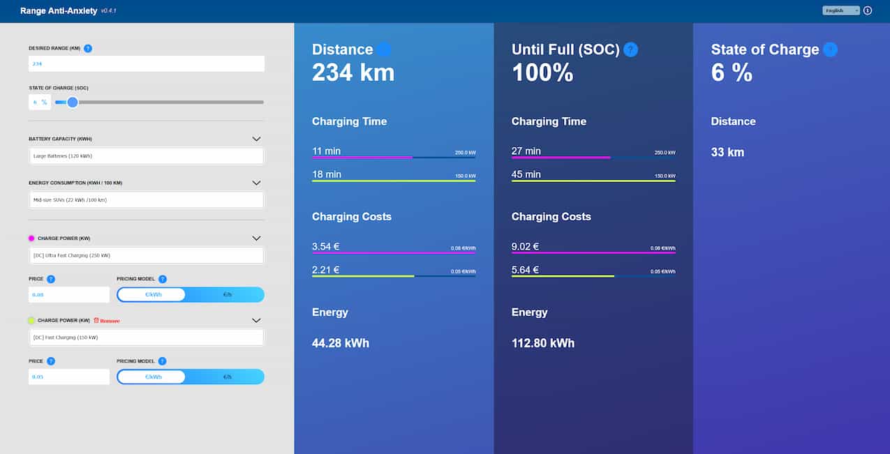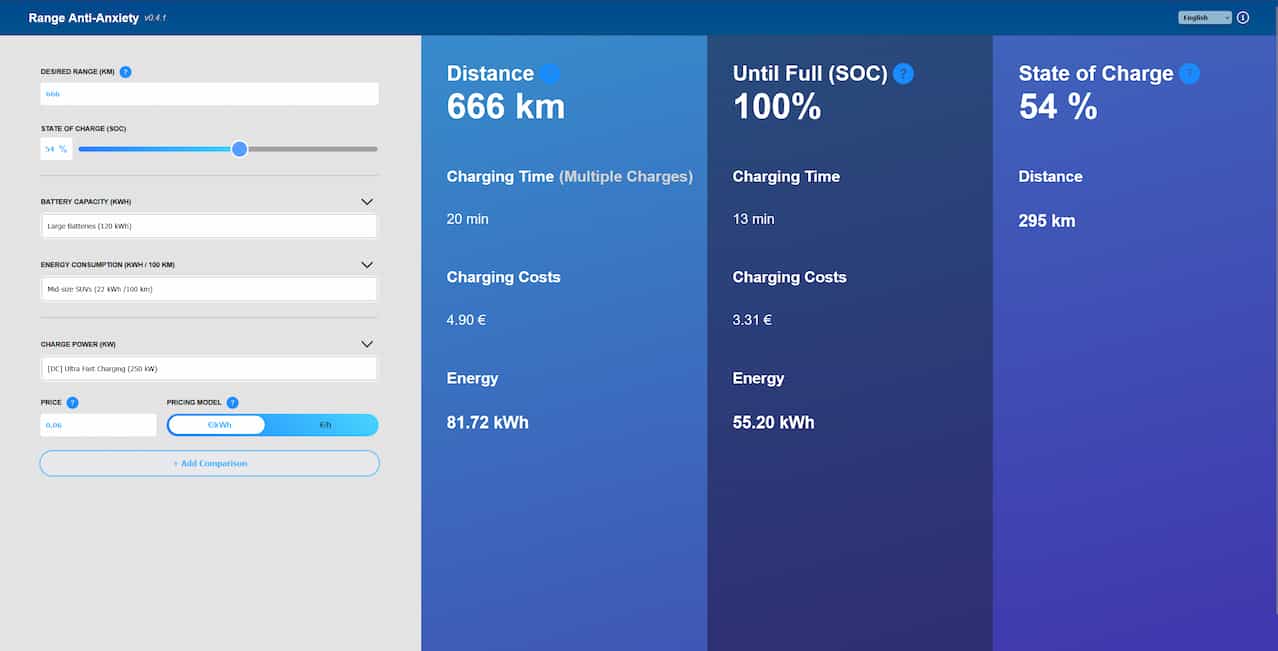 Range Anti-Anxiety is a calculator website for electric vehicle related issues. Users can estimate their car's current range, how much they would need to charge to reach a given distance, how long it would take and how much it would cost. The calculator also has an option for comparing two charging setups. The calculations are only simple estimates due to the very complex nature of all the real world variables involved. The project was completed as the bachelor's project of my degree and it was a group project.